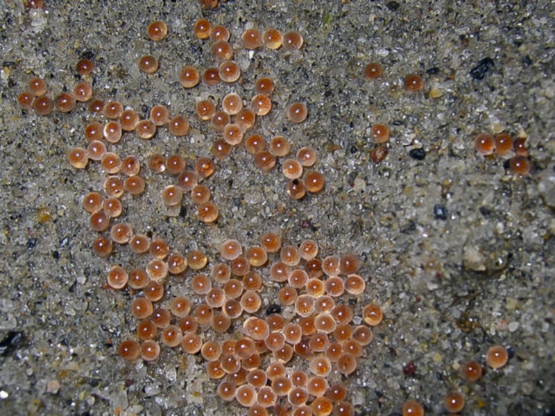 During these moonlit spawning runs, California grunion scurry about out of water to find one another. When they do, females dig tail first to lay their eggs under a few inches of sand, while males curl around them, releasing milt. Grunion eggs remain buried on the beach, out of water, as the adults return to the sea. Eggs incubate buried under a blanket of warm sand until the high tide of the next new or full moon washes them out to hatch in the ocean.
