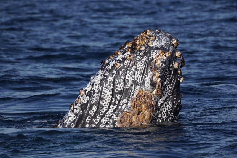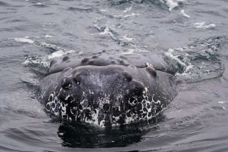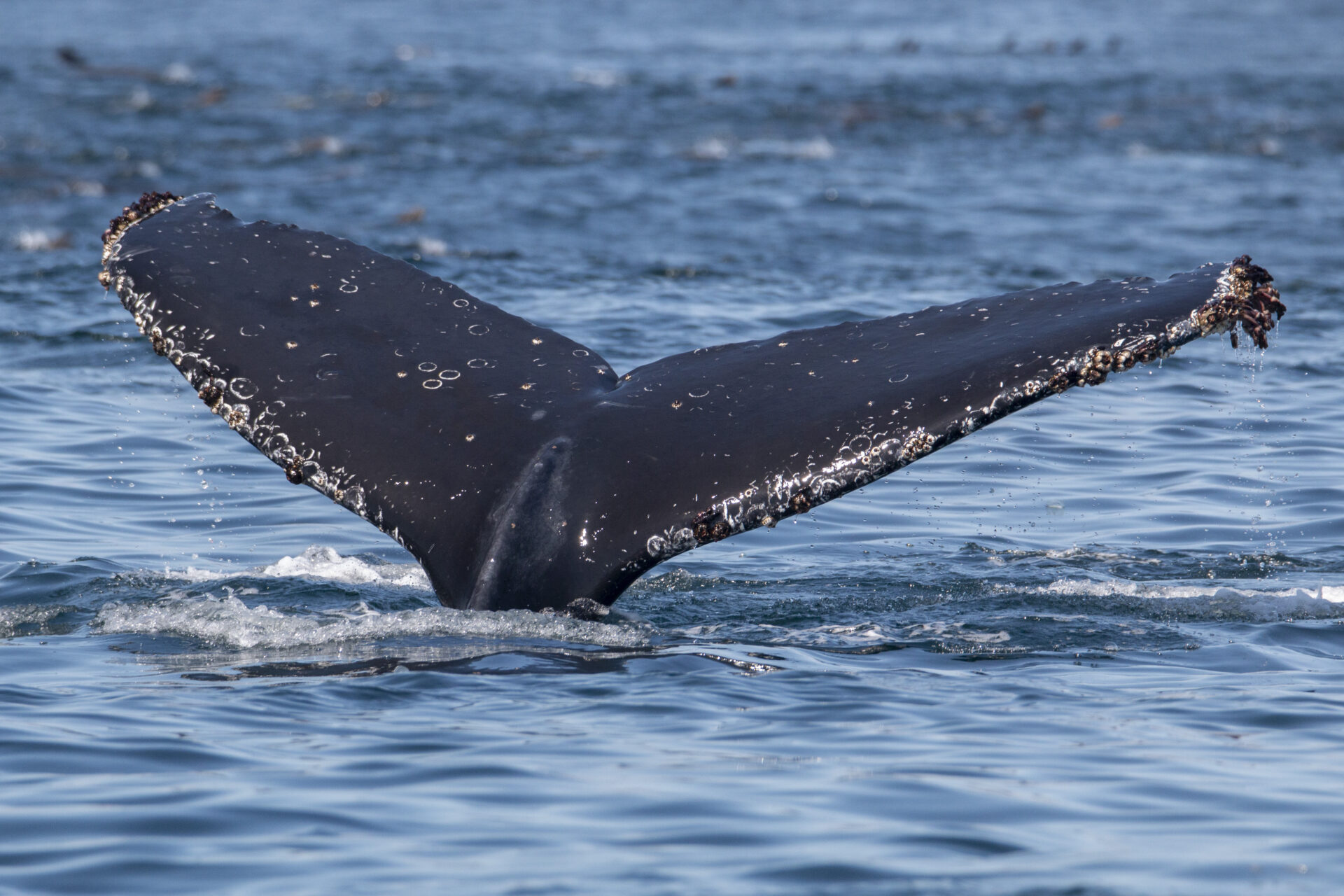 The whale rises again close to our port side, then our starboard side, and is soon identified as whale CRC-19874. CRC-19874 has been seen 32 times since 2021 and only ever within Monterey Bay.