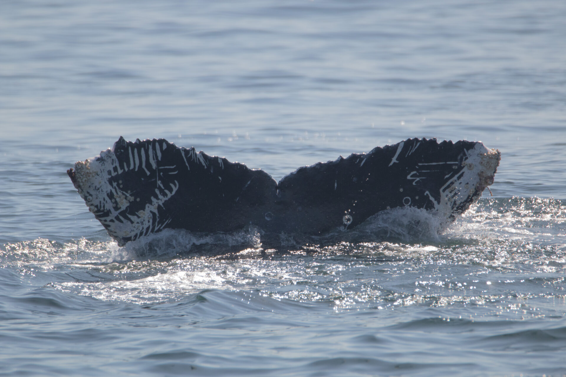 The two whales closest to us sink beneath the surface without showing their flukes. The next individual dives, raising heavily scarred tail flukes. Series of parallel rake marks are thickly etched in white against the black of the whale’s tail – this whale was attacked by killer whales. The rake marks – with the same spacing as killer whales’ peg-like teeth – scar all edges of the tail flukes, top and bottom.