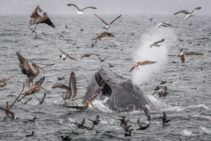 As we draw level with Moss Landing – putting us directly over the submarine canyon – the clustered blows of humpback whales grow taller. Humpbacks are just one of the species to capitalise on this bounty. Rafts of California sea lions churn the water, surfacing with raspy breaths. Gulls hang above with orange feet dangling, dropping down to pick up the spoils.