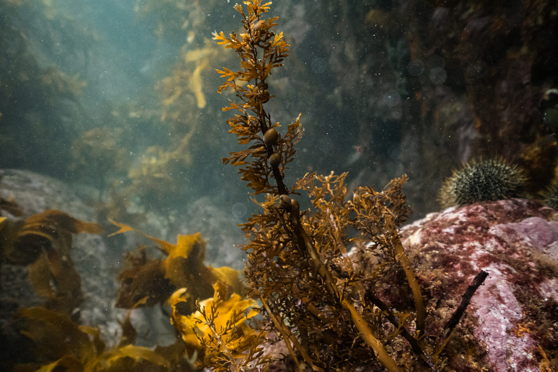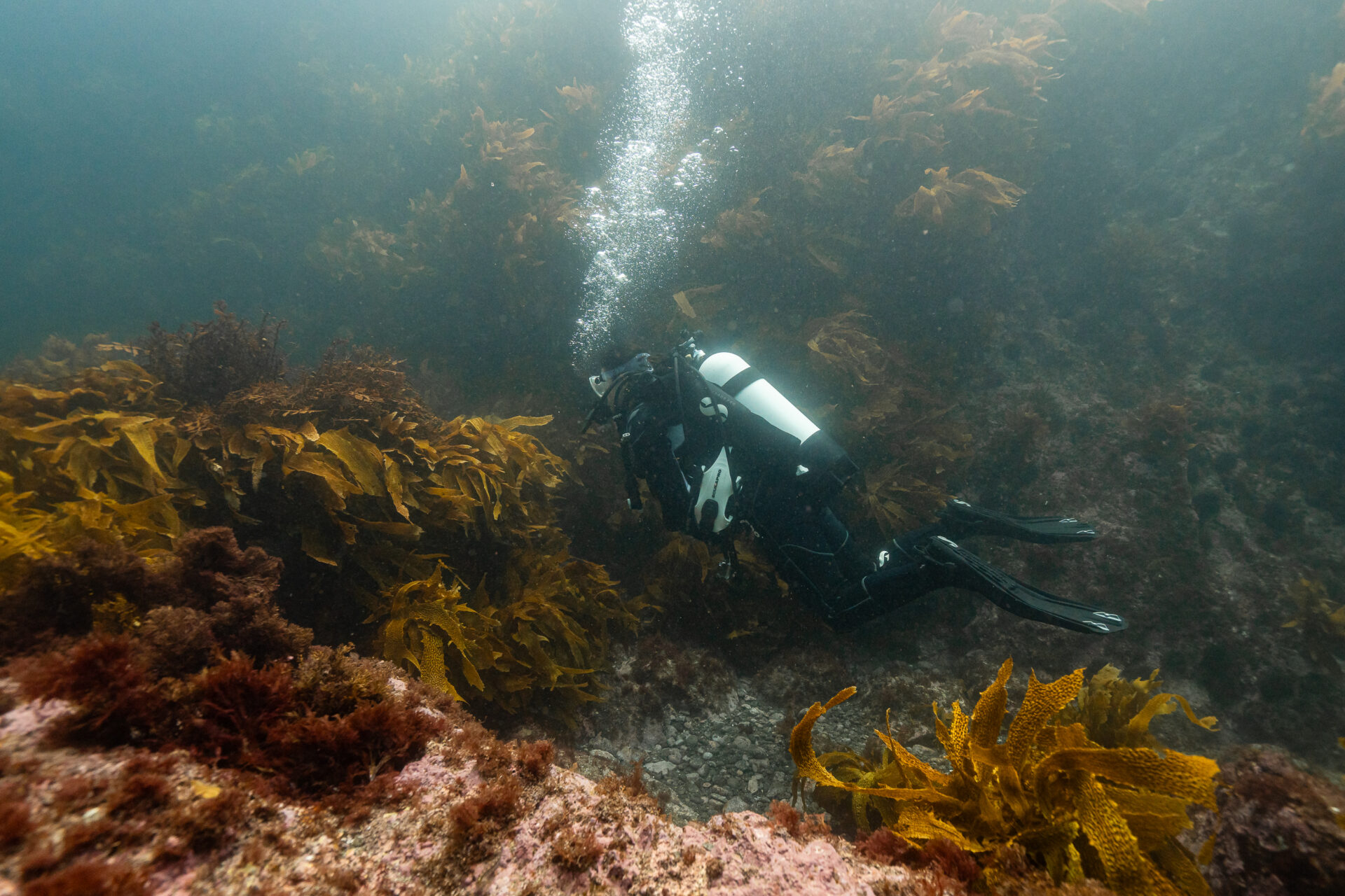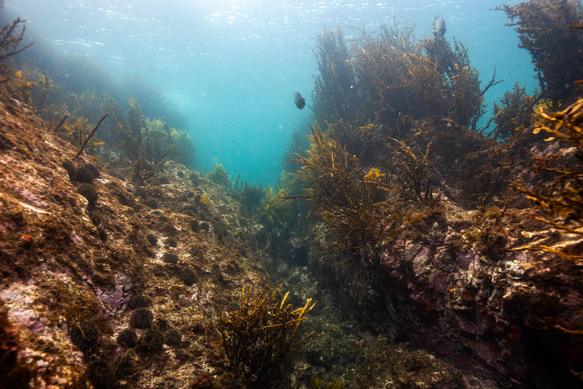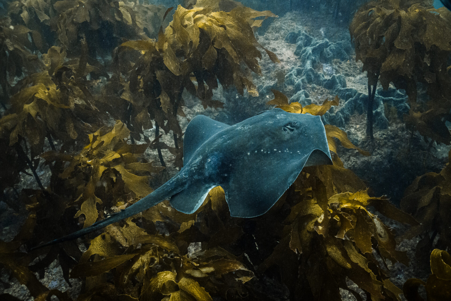 Diving through the swaying kelp forests, we entered a temperate underwater wonderland. Massive schools of trevally twisted through the water like silver ribbons, octopuses tucked themselves into rocky crevices, and sand tiger sharks lurked in the shadows, perfectly camouflaged in the dim light. Brightly coloured nudibranchs inched their way across reef walls, while stingrays hovered motionless on the seafloor. Where the kelp was healthy, the marine ecosystem flourished. But where it wasn’t – where kina (sea urchins) had taken over – vast barrens stretched before us, stark and lifeless.