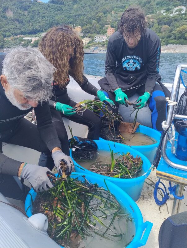In Liguria, researchers at DISTAV closely collaborate with local MPAs to stitch Posidonia patches back together. Their work is a form of marine horticulture. First, they source their crop. They dive in search of areas on the seafloor where fragments of Posidonia, detached by currents or ripped up by anchors, accumulate. “It’s a way to give new life to material that would otherwise be lost,” said Chiara Robello, also a PhD candidate at DISTAV at the University of Genoa.