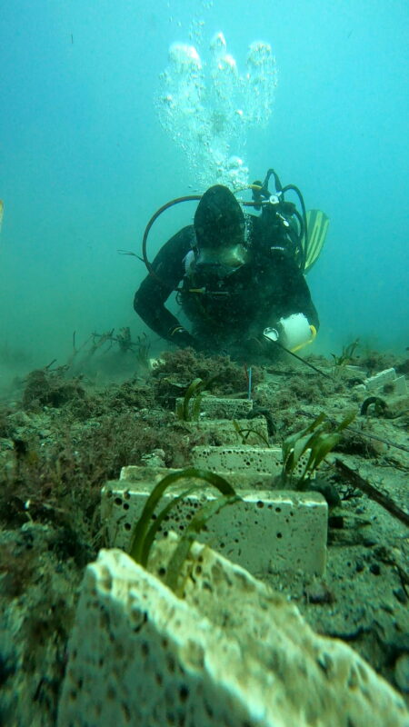 “In Genoa, a block away from the laboratory where Robello and Pelizza work, Claudia Pezzilli, a PhD candidate at DISTAV, uses small blocks made from porous Roman travertine, a type of limestone.” The block has a wedged shape with a fine central channel. “The seed is placed there, and as the roots grow, they follow the channel and anchor themselves directly into the block’s many small holes,” she explained. After cultivating the seedlings in the lab for six to 11 months, the researchers take to sea to place the blocks into small holes dug into the existing meadow matte.