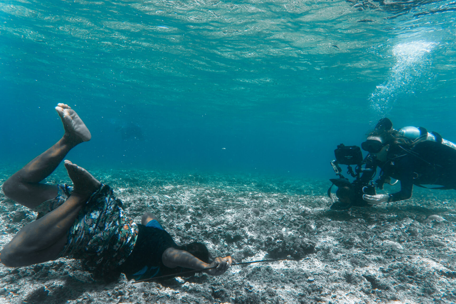 The women are already ahead of us, dropping off the reef flat and into the water with their spears. To my delight there is not even a whisper of current today and I slip into flow state as I start to shoot their movements underwater. It’s fascinating to watch them fish. Each of them uses a handmade wooden speargun – carved from local hardwood, with a simple rubber band mechanism – a far cry from the sleek aluminium or carbon you see in commercial freediving gear. They’re a little more clunky perhaps, but just as effective in the skilled hands of the Wawata Topu.