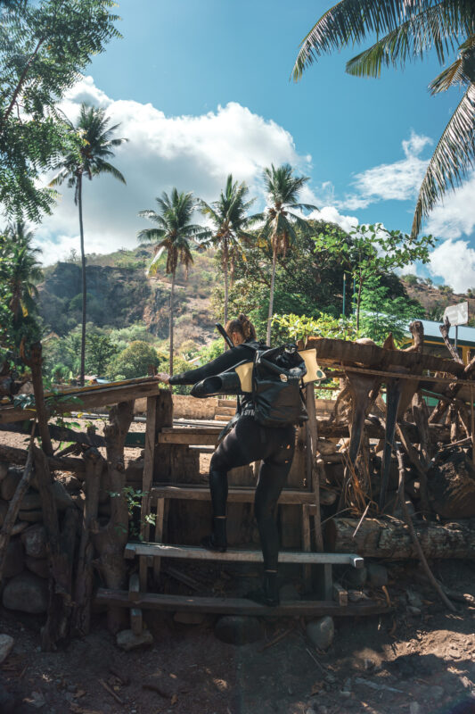 On this side of Atauro there’s no dive center. No tanks, no compressor, no spare bits and bobs. This side of the island is beautiful but off-grid, so before arriving in Adara, I’d arranged with a dive shop on the other side of the island to deliver six tanks to us – what I’d hoped would be enough for the whole shoot. I’ve brought a friend along to act as my safety diver – we’re meant to be self-sufficient and we’ve brought everything with us (gear, cameras, batteries) knowing full well that if anything goes wrong, there’s no backup.