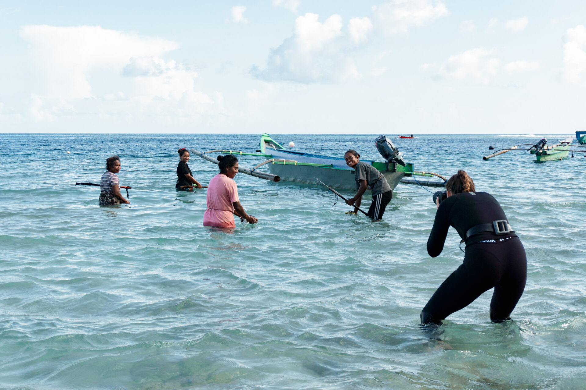 As we make our way around the island’s western coast, Adara comes into view. Our boat tucks into the small, circular gap in the reef that acts as the harbour of the small village. Landing at high tide, we had no choice but to unload directly into the water. The Wawata Topu (the local freediving women who I’ve come to photograph) come straight down to help, lifting tanks and camera gear from the boat with practiced ease.