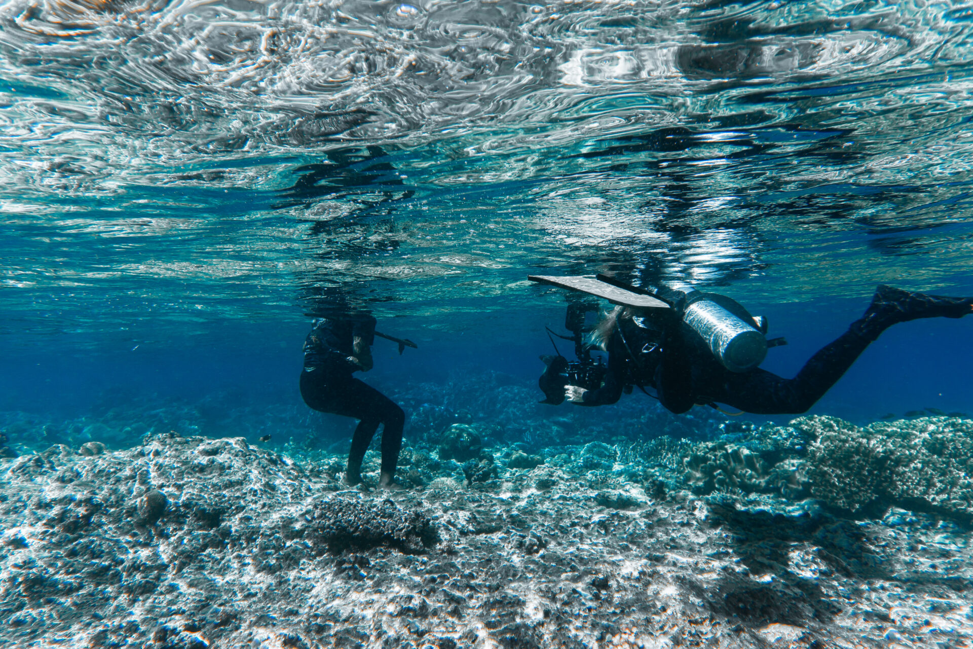 Sometime after lunch, the dive boat finally arrives – and I find myself waving like a madman from shore, as I can’t risk the boat returning to their dive centre without dropping the tanks. They finally spot me and without thinking I wade out across the reef flat fully clothed, the tide pushing against my legs. It’s awkward and slightly ridiculous. But I’m also excited because this is the gear I need to start the shoot.