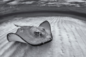 I’m quickly surrounded by large tornadoes of yellow snappers, numerous eagle rays, and seemingly endless fevers of grey reef sharks. Wherever I look, I spot these apex predators swim across the reef in their elegant side-to-side motion and notice that they’re keeping their distance from us divers. It’s a hopeful sign that they’re not being fed by humans to attract them to this special dive site.