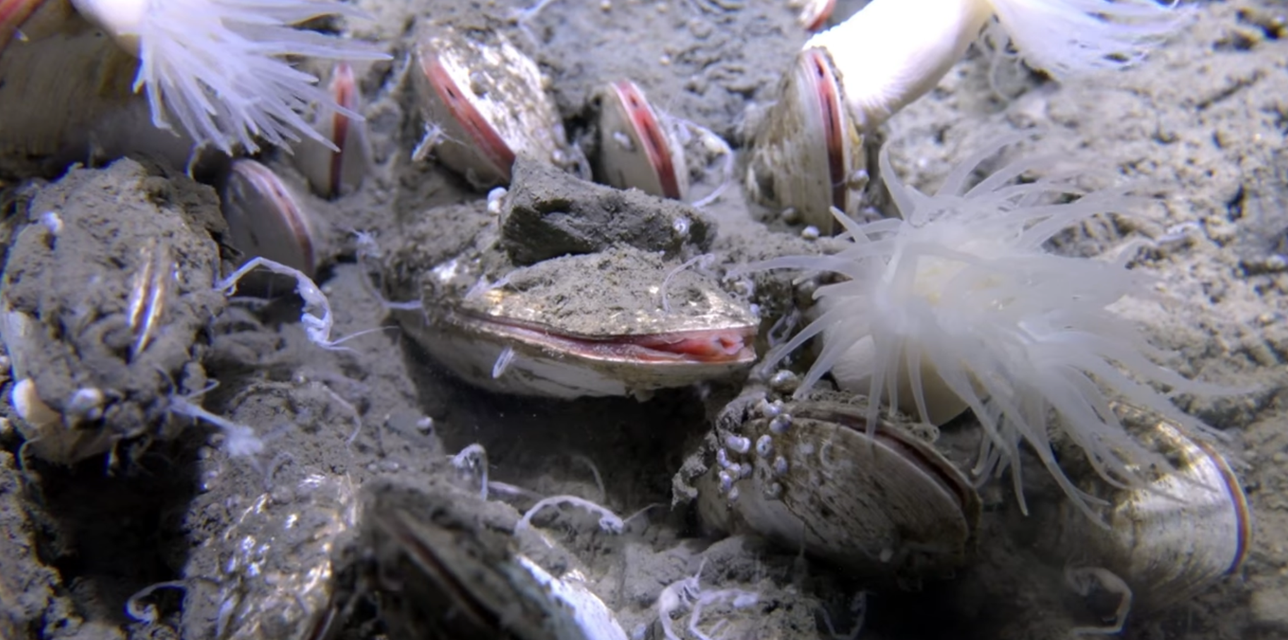 Dominated by tube worms and clams, the community is able to survive at depths through a process known as chemosynthesis, meaning that life here is nourished by the fluids ‘rich in hydrogen sulfide and methane’ seeping from the seafloor, which they then turn into energy.