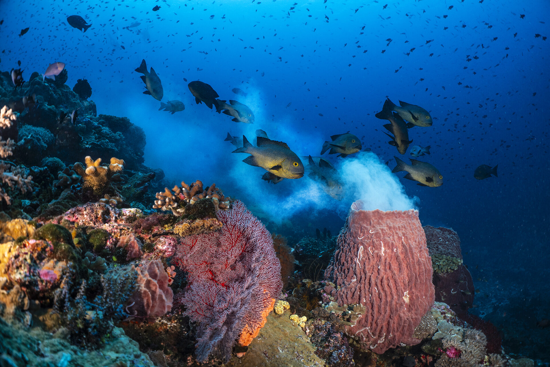 Clouds of white spawn billow from a giant barrel sponge, a rare and fleeting event that breathes new life into the reef. Surrounding the sponge, a frenzy of Midnight Snappers, feast upon the rising plumes. Mouths agape these opportunistic feeders take turns consuming the nutrient-rich spawn, plunging into the white clouds, gorging themselves.