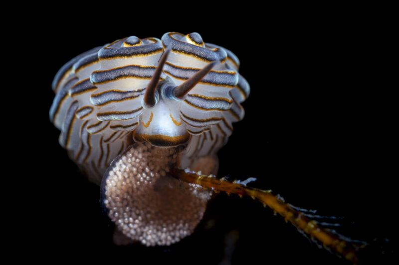 Doto greenamyeri, a species of sea slug, lays its eggs. Due to its appearance, the nudibranch is often nicknamed the ‘donut sea slug’. “This is my first time to encounter this sea slug while laying its eggs,” says Mazarese.