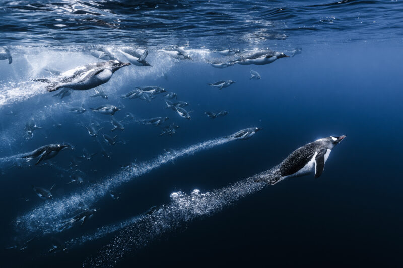 "It’s amazing how fast gentoo penguins are able to build a colony during the austral summer in the Antarctic peninsula," says Barats. "Port Charcot is usually a good place for this. This sheltered bay surrounded by mountains and icebergs is a perfect base for gentoos. We anchored our sailboat in this bay for three days, near the colony. We got in the water every day to enjoy the spectacle of these highly curious birds, who came to check on us so many times. Clumsy on land, these birds are fast and agile in the water."